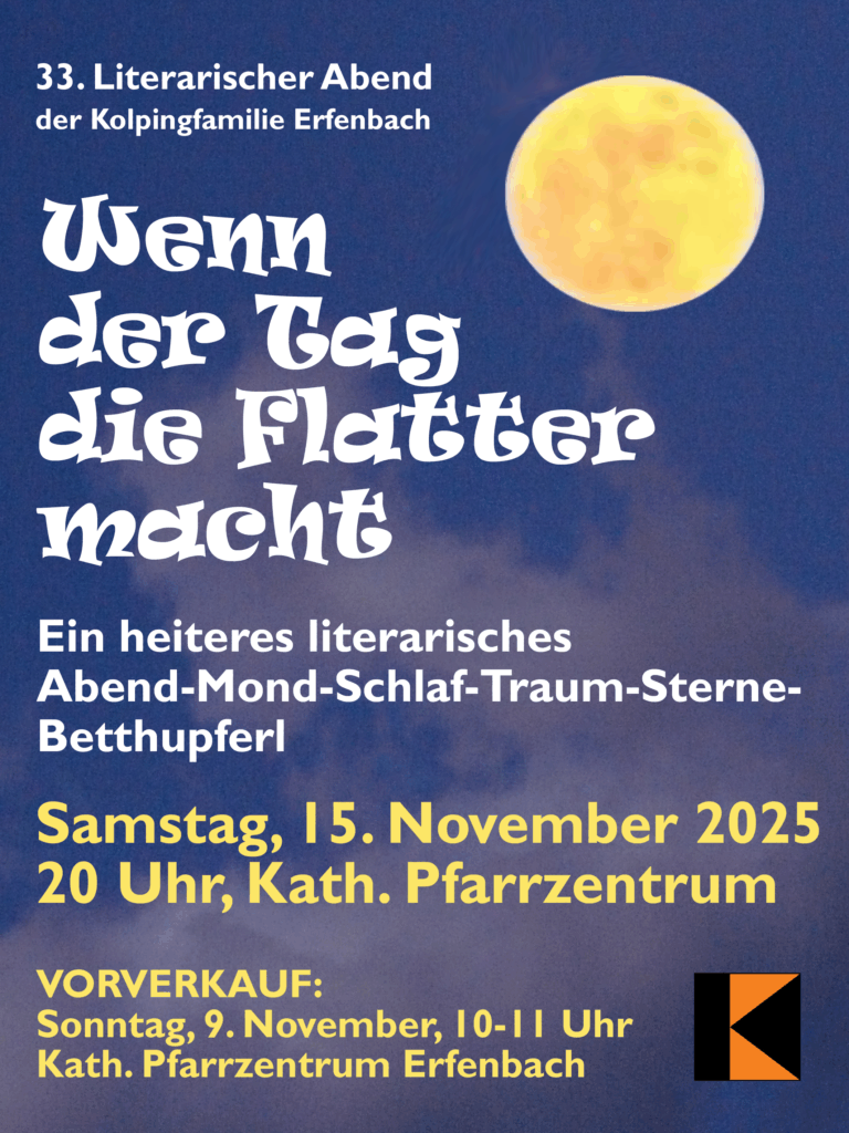 Lassen Sie sich überraschen am Samstag, dem 15. November, um 20 Uhr im Katholischen Pfarrzentrum in Erfenbach.